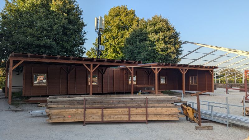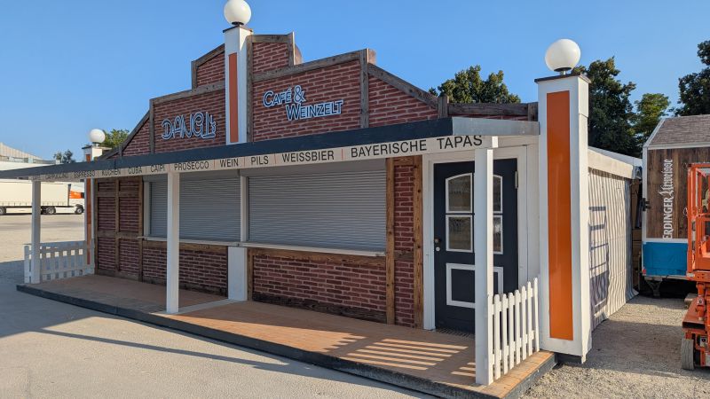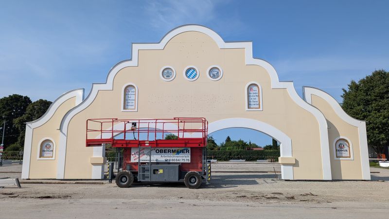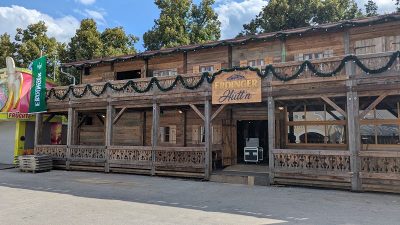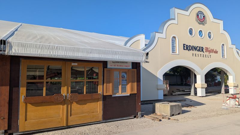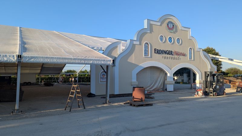 11.08.2025 - Der Aufbau des Erdinger Weißbräu Festzeltes, der Erdinger Hütt'n, Dangl`s Cafe & Weinzelt und Kollmann's Bratwurststand schreitet voran.