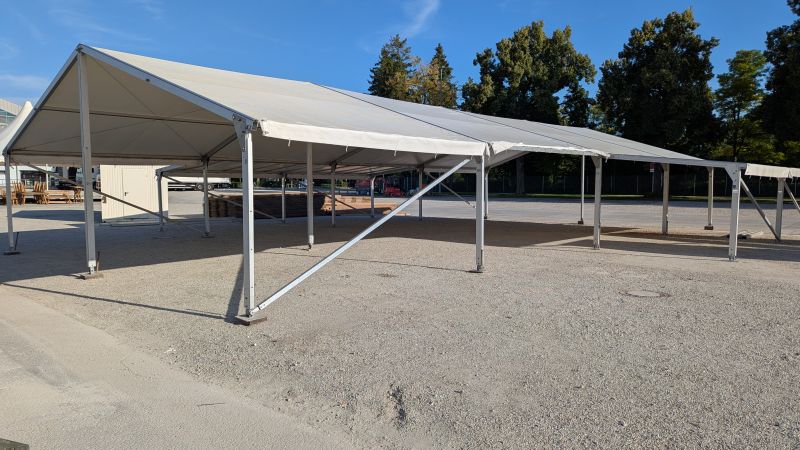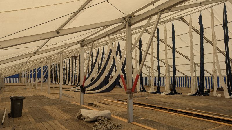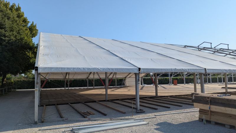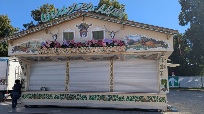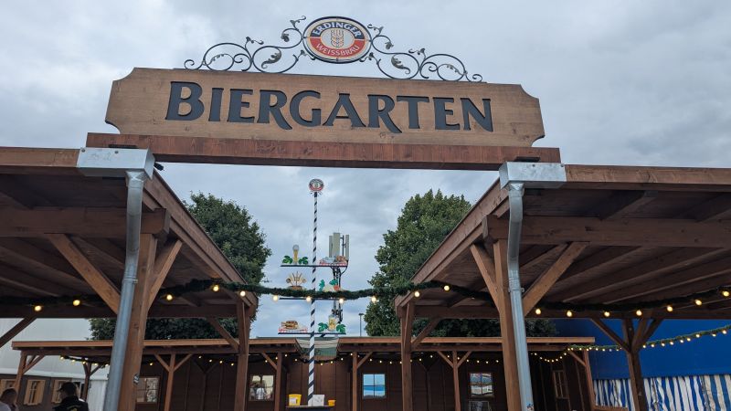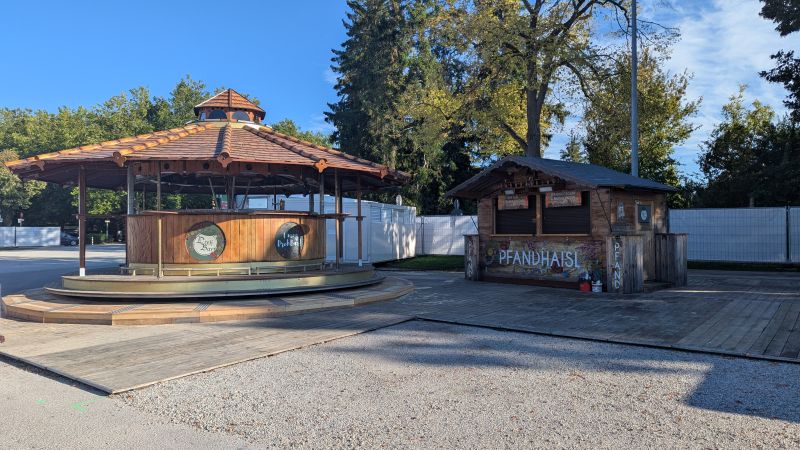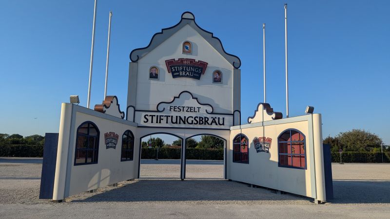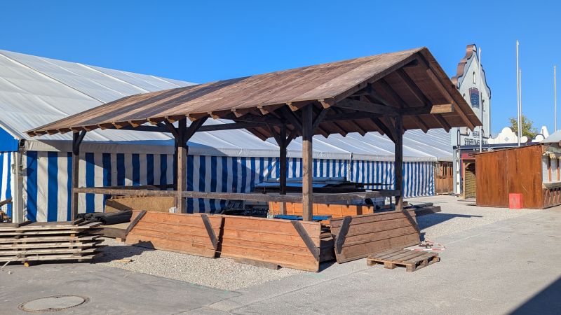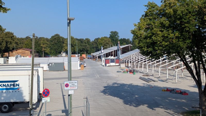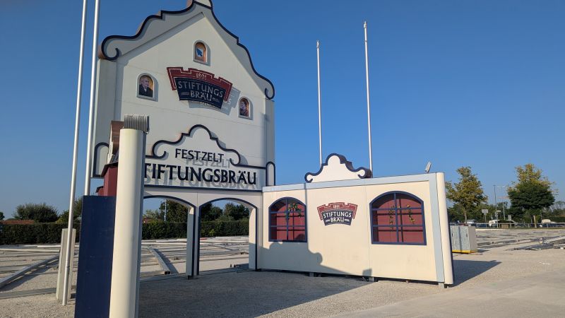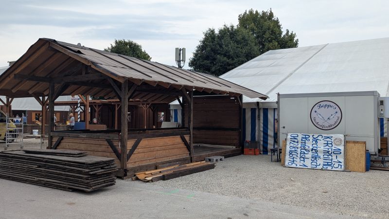 15.08.2025 - Der Aufbau der Erdinger Hüttn und des Fischer's Stiftungszeltes schreitet voran. Auch der BRK-Glückshafen ist schon da.
