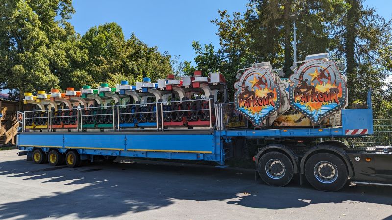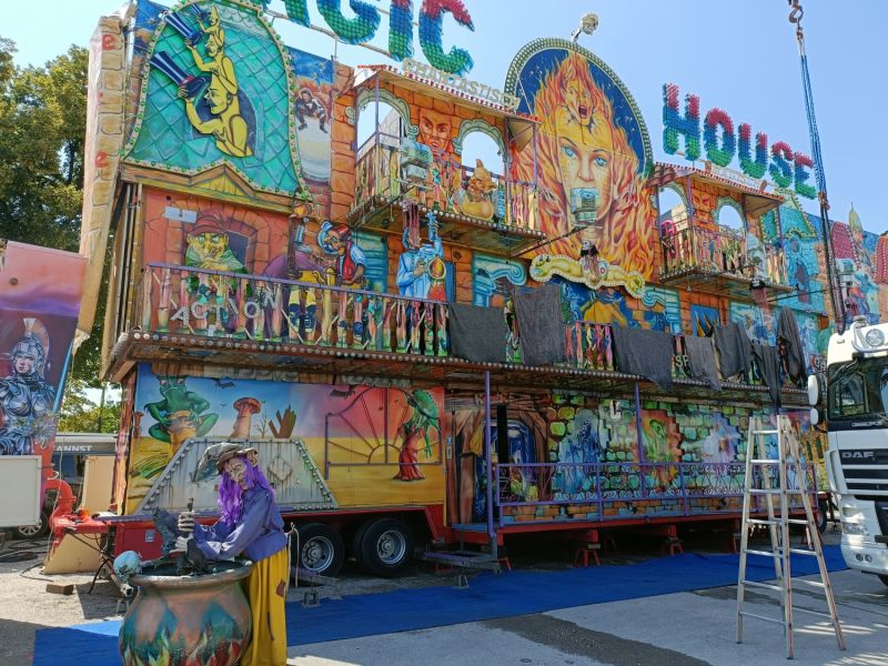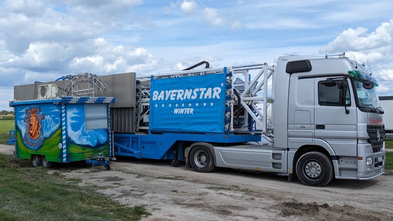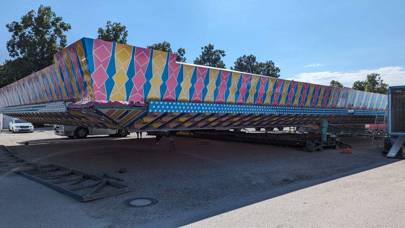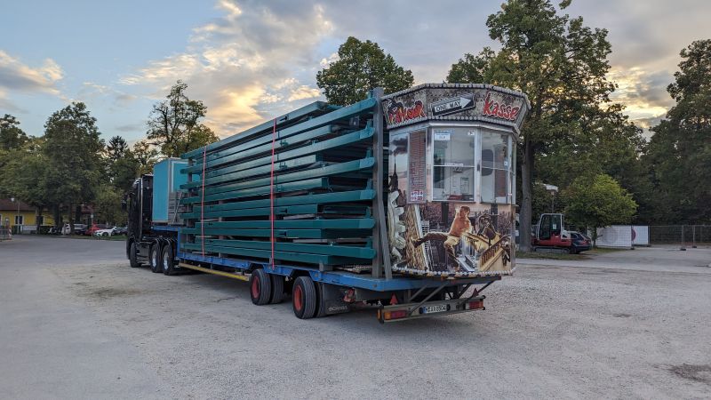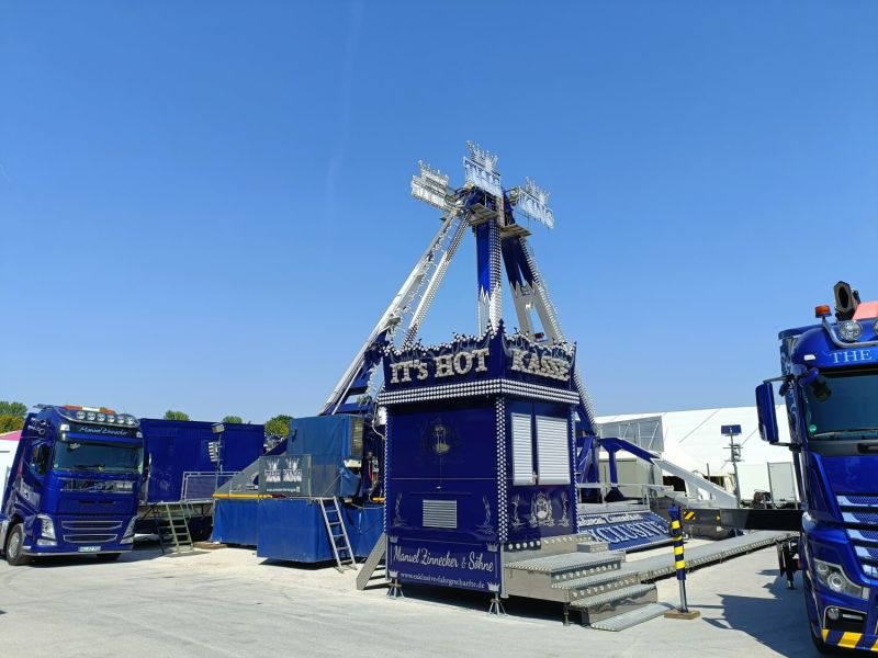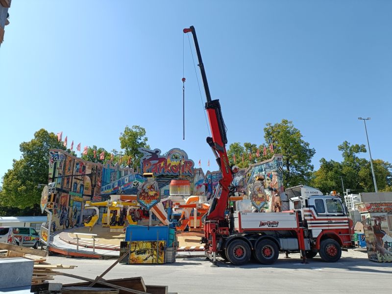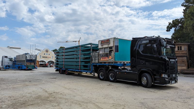 15.08.2023 - Der Aufbau des Erdinger Herbstfestes 2023 geht in die heiße Phase. Viele beliebte Stände und Fahrgeschäfte sind angekommen.